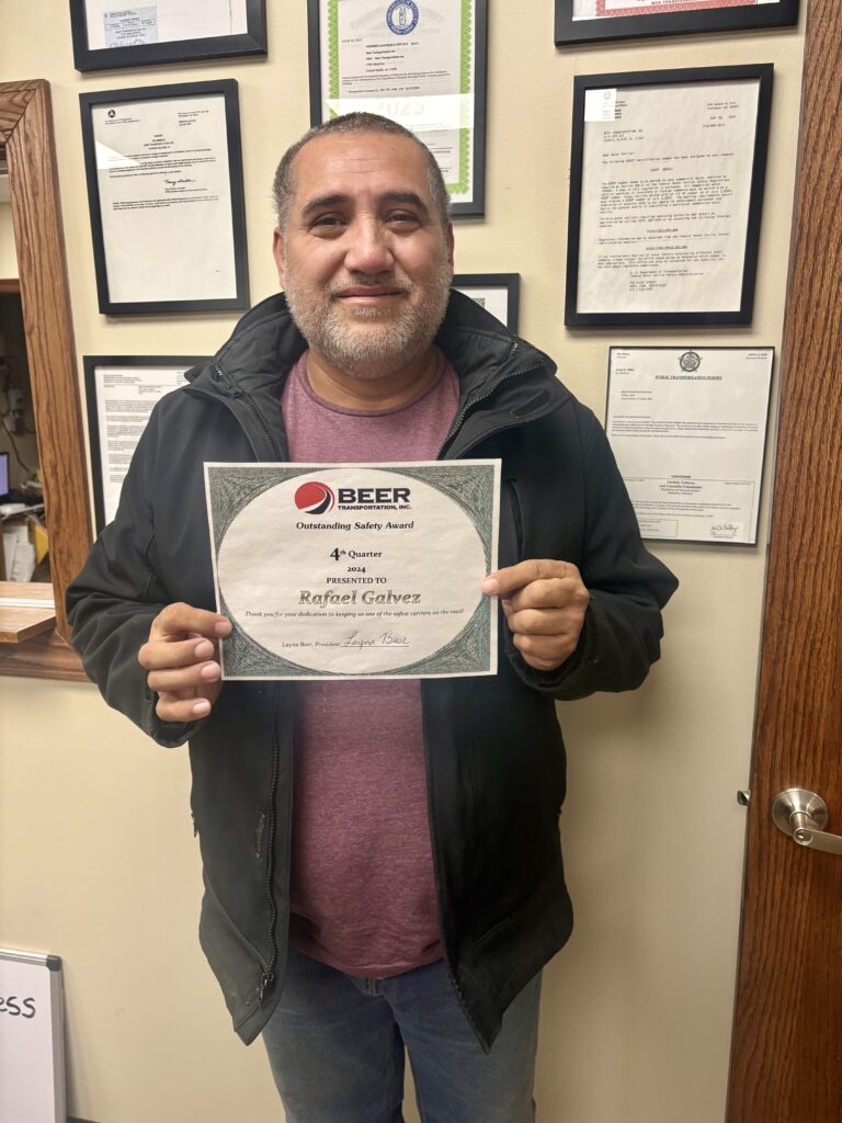 Rafeal Galvez is the winner of the 4th Quarter 2024 Safety Award. His attention to detail has earned him this award and we appreciate him for setting the safety car high for the team. It shows that compliance, safety and accountability always come first for this awesome driver! Thank you Rafeal for your dedication to safety! We are thankful to have you at Beer!